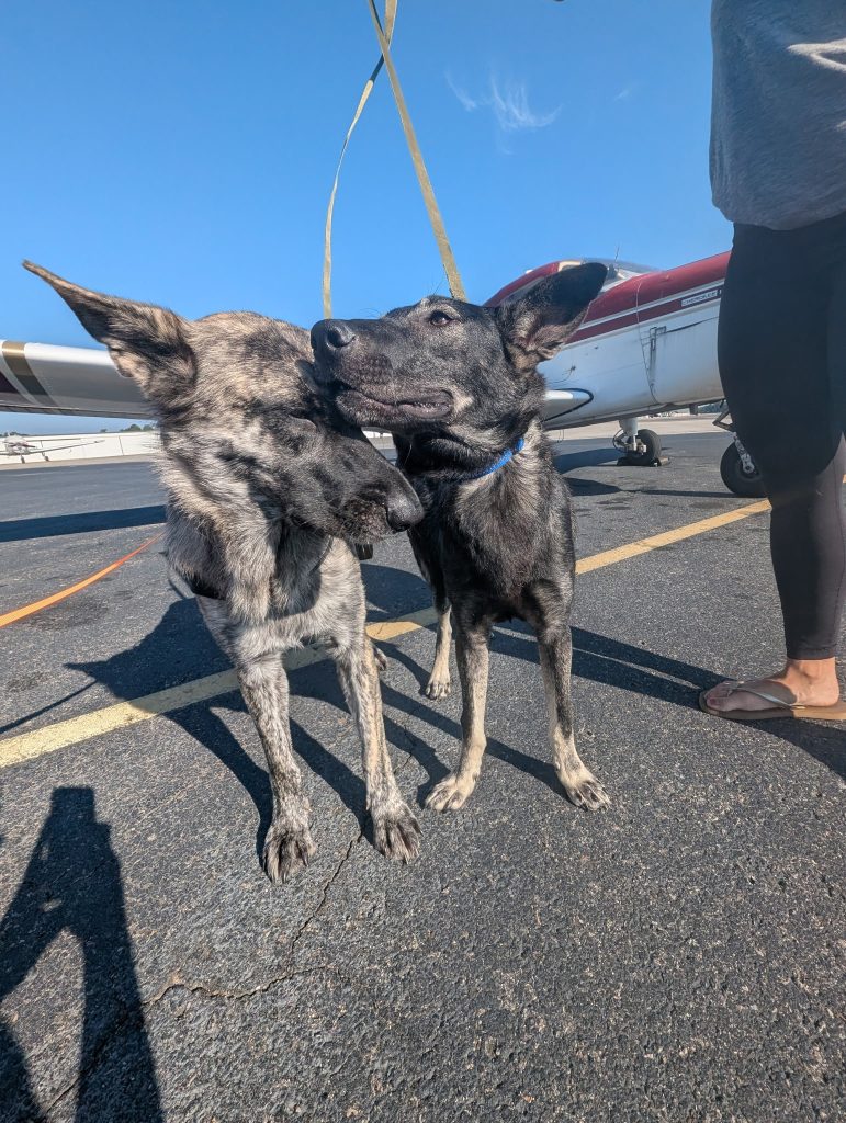 GRU arrived and we have a vet competition, one says he is a 2 yo one vet says 10 months. He is actually smaller than 60 pounds so clearly a mix – but ADORABLE, he is maybe 40 pounds and loves to play. He arrived from Pilots and Paws – the most generous organization. He was an owner surrender and had lived with several other dogs all rescued). He and Paris were rescued by us together and are now BFFs. . He is utd on shots, neutered and healthy. His dad had to go into the hospital for involved reasons. Gru is a mild personality but playful. He is friendly after he settles to changes definitely sweet, happy and relatively calm. He was well cared for and does not know why his life changed so abruptly. Grtu is a medium energy sweet dog. If you are interested in giving Gru a home kindly email gabrielsgsdrescue@gmail.com for an application.
