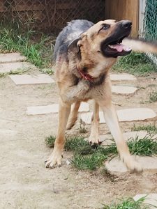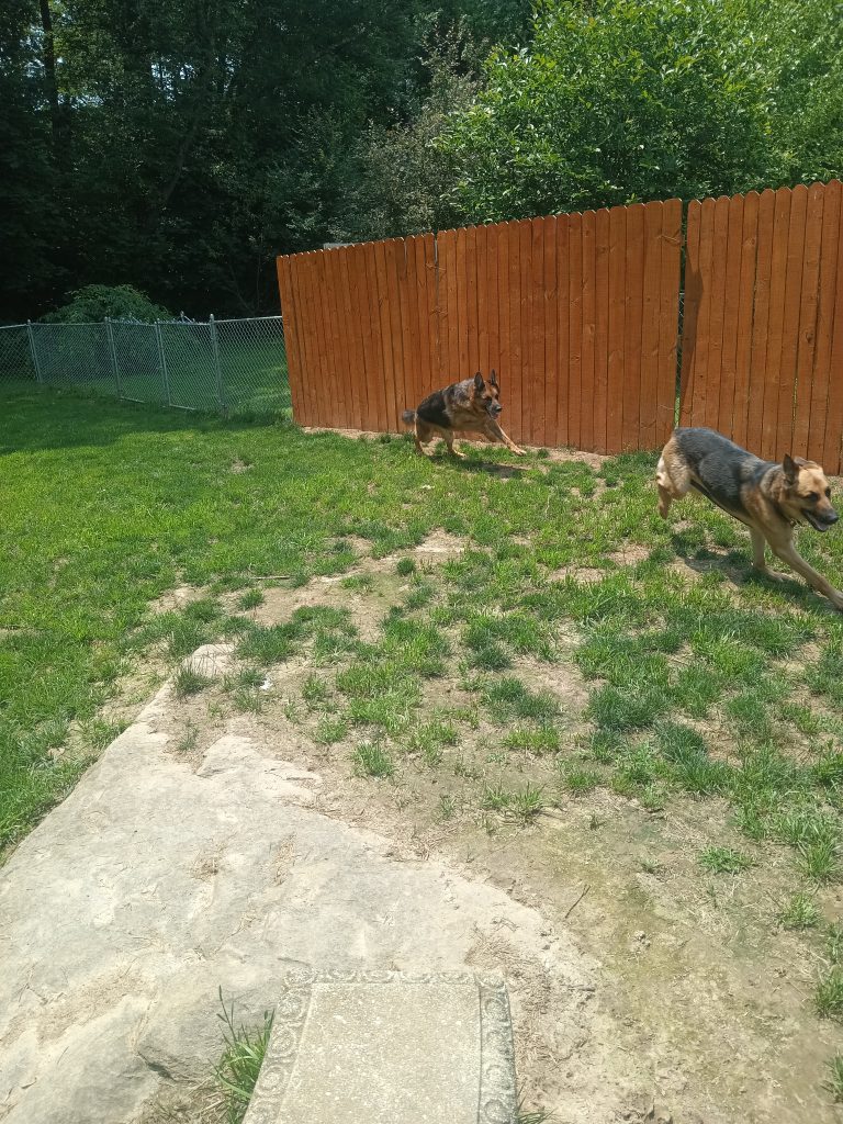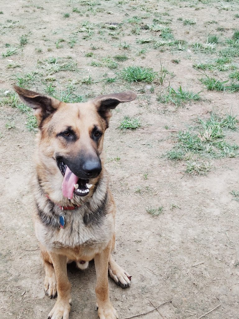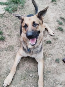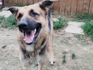 MAX – Max is a one ish year old gsd.  He is possibly part Anatolian since he is really REALLY tall at his young age.  We have found Max to be a complete goofball.  He lumbers around the yard and absolutely loves all dogs.  After he knows you , he actually listens to direction, especially with treats involved.  Once he does know you he is completely loyal.  His favorite activity is pro wrestling in his yard with his big friends – or little ones.  And he wants to do the same in the house but has learned not to do so.  He spends a fair amount of time lying quietly inside.   He is a little bow legged and has the stride of a duck.  He mistakes fingers for pup-peronis at times but is learning to cool it. He has what we call helicopter ears. And a tongue that hangs sideways pretty constantly.  He knows a fair number of commands, including sit, down and paw – which he will use to smack you for a treat.  He knows he is a great dog.  He is willing to give you the chance to figure it out.  He is also very much a shepherd and will protect you, including from all forces outside of the bathroom while he lays inside during your shower time.  It is a very serious job.